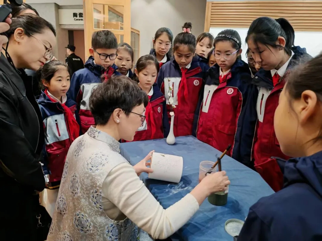 江苏和湖南两省相关单位领导出席活动并参与巡展。活动现场,文化交流与非遗传承亮点纷呈。湖南省文物局相关领导代表湖南向江阴市博物馆赠送醴陵釉下五彩“九秋图”瓷瓶,由江阴市博物馆永久收藏;国家级非物质文化遗产醴陵釉下五彩瓷烧制技艺代表性传承人陈利,现场演示“勾线分水”核心非遗技艺,笔锋游走于素白瓷胎之上似流云婉转,色料晕染通透莹润如美玉天成,令现场观众赞叹不已;20名少年在陈利老师的指导下,沉浸式体验釉下五彩瓷彩绘创作,零距离感受非遗艺术的独特魅力。与此同时,醴陵市博物馆特色文创产品同步亮相江阴市博物馆文创区,让江南观众可将“瓷都”之美带回家。